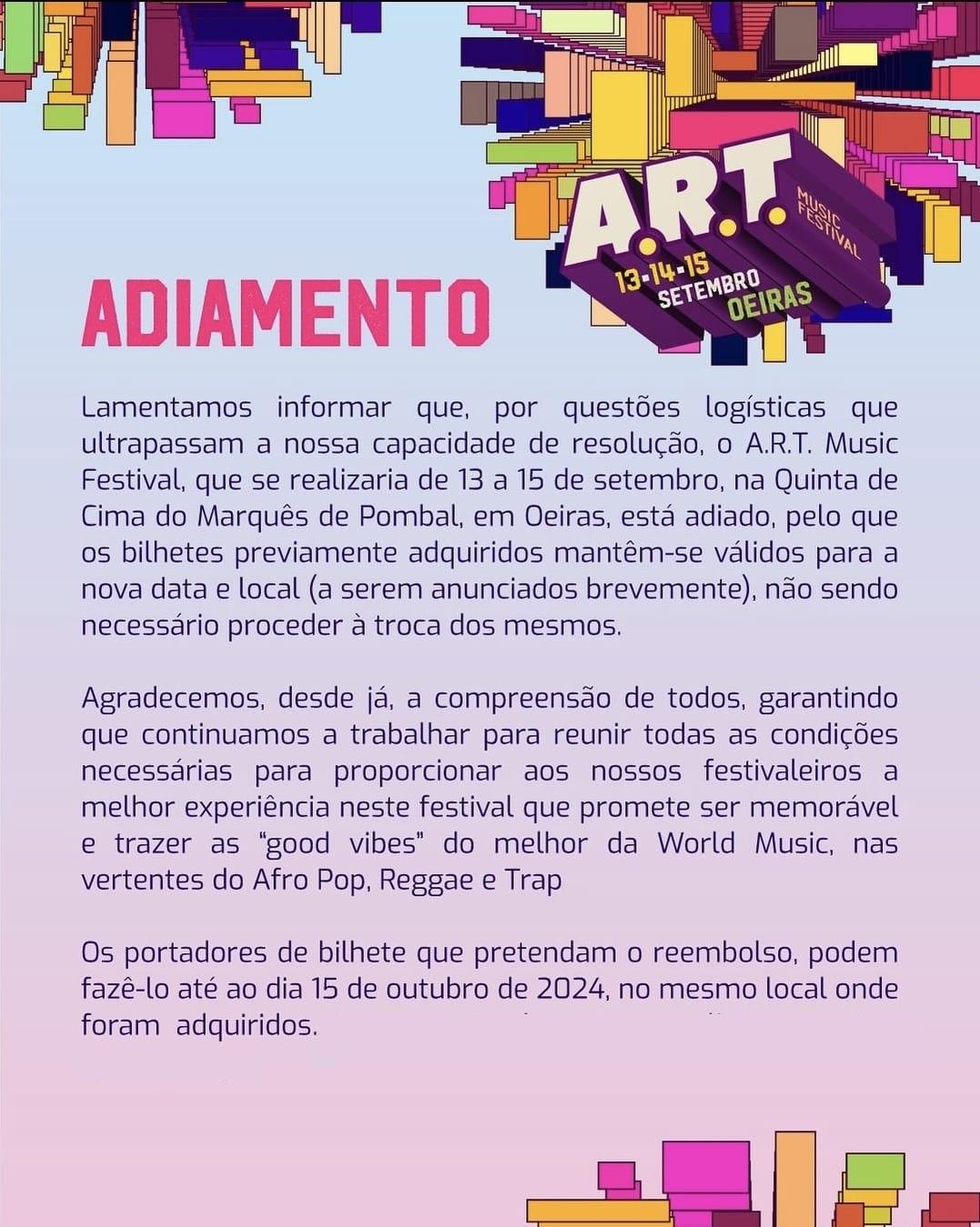 -> Lamentamos informar que, debido a cuestiones logísticas, A.R.T. MUSIC FESTIVAL, que tendría lugar del 13 al 15 de septiembre en la Quinta de Cima do Marquês de Pombal, en Oeiras, se pospone, por lo que las entradas ya adquiridas siguen siendo válidas automáticamente para la nueva fecha y lugar (que se anunciará próximamente).