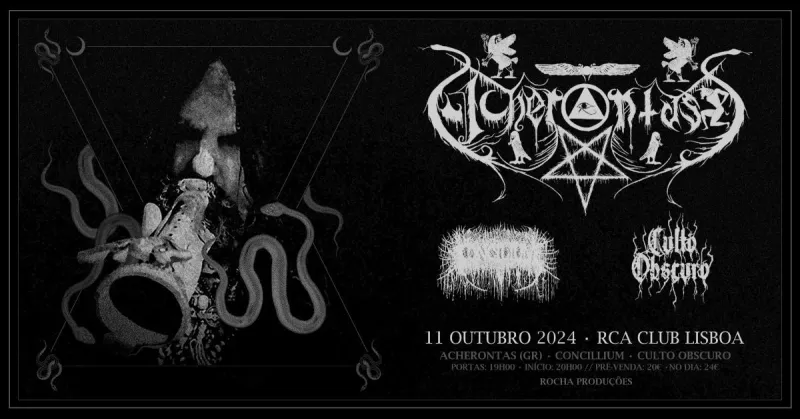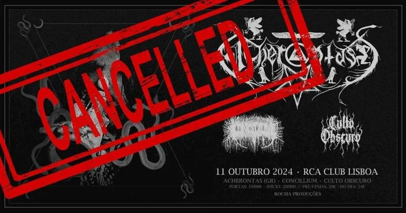 Acherontas actuarán en Portugal en 2025 en un lugar y fecha que se anunciarán próximamente, podrán para solicitar el reembolso de las entradas en los lugares donde las adquirieron, nos disculpamos por las molestias y pedimos su comprensión, gracias.