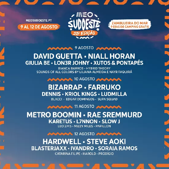 Del 9 al 12 de agosto de 2023, MEO Sudoeste volverá a ser la experiencia vacacional más inolvidable para miles de jóvenes, gracias a una serie de ingredientes que siempre funcionan: los amigos, la playa, la acampada, un ambiente que no podrás olvidar y la música que está en los oídos de todos. Hip-hop, trap, electrónica o música latina son algunos de los ritmos que no pueden faltar en la mejor fiesta.