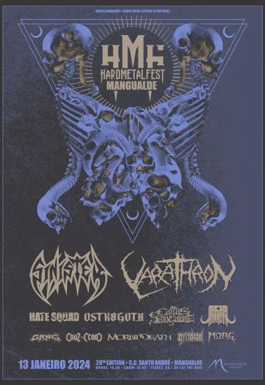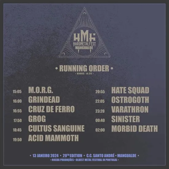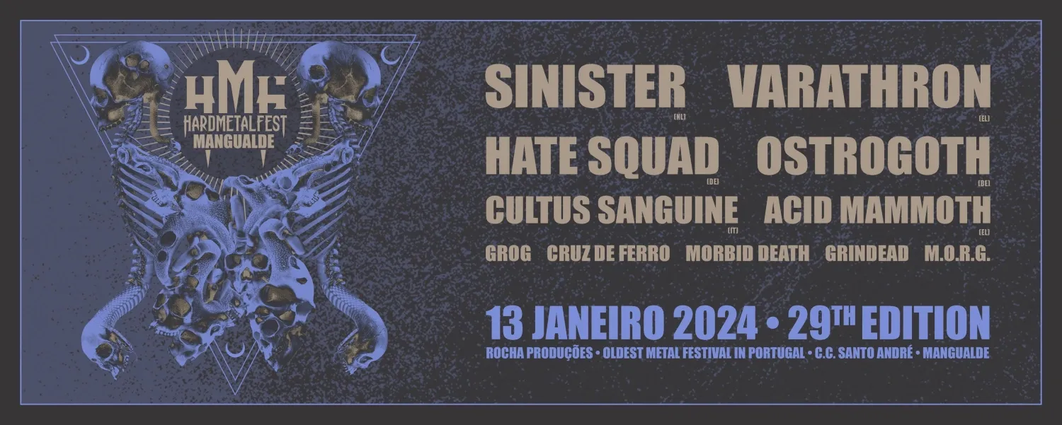 El 13 de enero de 2024, en el Centro Cultural Santo André (Mangualde), con la presencia de los neerlandeses Sinister, los griegos Varathron y Acid Mammoth, los alemanes Hate Squad, los belgas Ostrogoth, los italianos Cultus Sanguine y los nacionales Grog, Cruz de Ferro, Morbid Death, Grindead y M.O.R.G. ¡No te lo pierdas! Debut absoluto en Portugal y esperada visita de los veteranos de la escena Black Metal griega, VARATHRON. SINISTER de Holanda son otro de los cabezas de cartel del festival y son un nombre imperdible dentro del Death Metal mundial. Referencias de los años 80 al Heavy Metal tradicional, los belgas OSTROGOTH, así como el regreso de los alemanes HATE SQUAD con su Hardcore/Power Thrash son otros de los ingredientes del menú. También desde Grecia y por primera vez en Portugal estarán los Doomsters ACID MAMMOTH. Vampire, Gothic, Obscuro es el sonido de los veteranos italianos CULTUS SANGUINE.