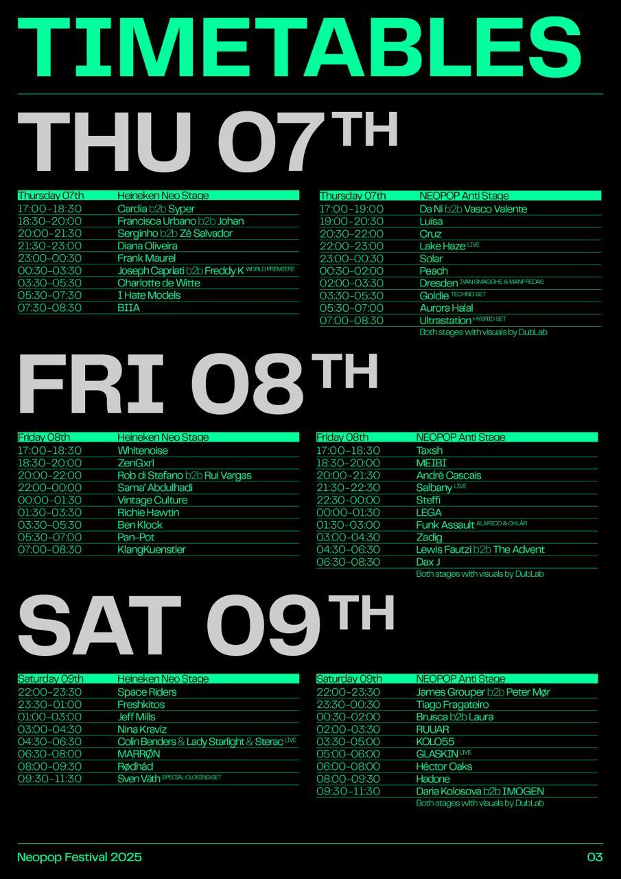 Aurora Halal, BIIA, Cardia b2b Syper, Charlotte de Witte, Cruz, Da Ni b2b Vasco Valente, Diana Oliveira, Dresden, Francisca Urbano b2b Johan, Frank Maurel, Goldie [techno set], I Hate Models, Joseph Capriati b2b Freddy K [World Premiere], Lake Haze, Luísa, Peach, Solar, Serginho b2b Zé Salvador, Tiago Fragateiro, Ultrasta tion [Hybrid Set]