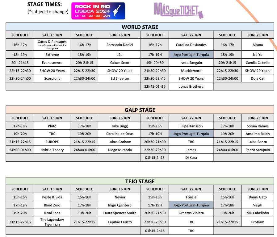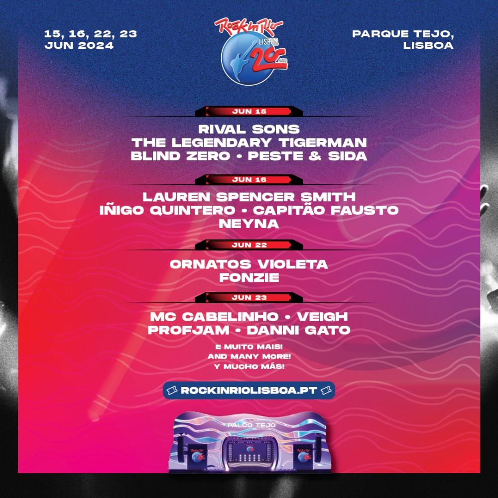 Nuevo escenario añadido: Palco Tejo. Patrocinado por Ornatos Violeta, para celebrar el 25 aniversario del lanzamiento de su icónico segundo álbum "O Monstro Precisa de Amigos". Además de la banda de Manel Cruz, el nuevo escenario del Rock in Rio Lisboa también contará con: Blind Zero, Capitão Fausto, Danni Gato, Fonzie, Mc Cabelinho, Neyna, Peste & Sida, ProfJam, The Legendary Tigerman, Veigh, y los ya anunciados Iñigo Quintero, Lauren Spencer Smith y Rival Sons. Puedes ver el cartel de este escenario, desplazándote en las imágenes del evento, más arriba en esta página.