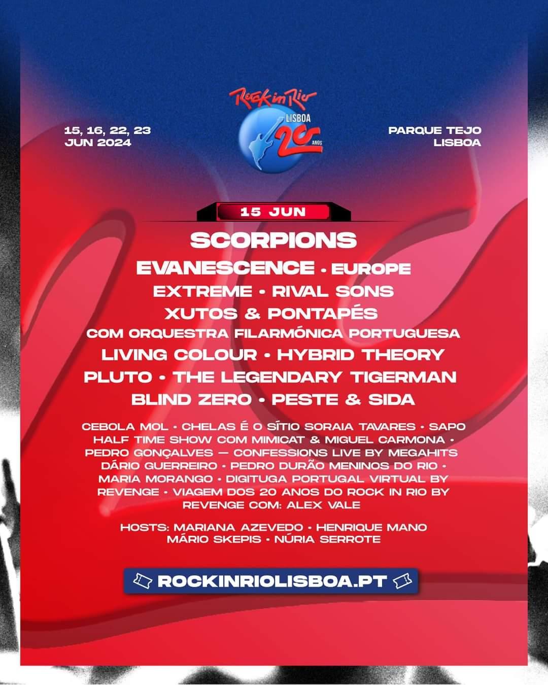 15/06: SCORPIONS, EVANESCENCE, EXTREME, XUTOS & PONTAPÉS, HYBRID THEORY, RIVAL SONS, PLUTO, LIVING COLOUR